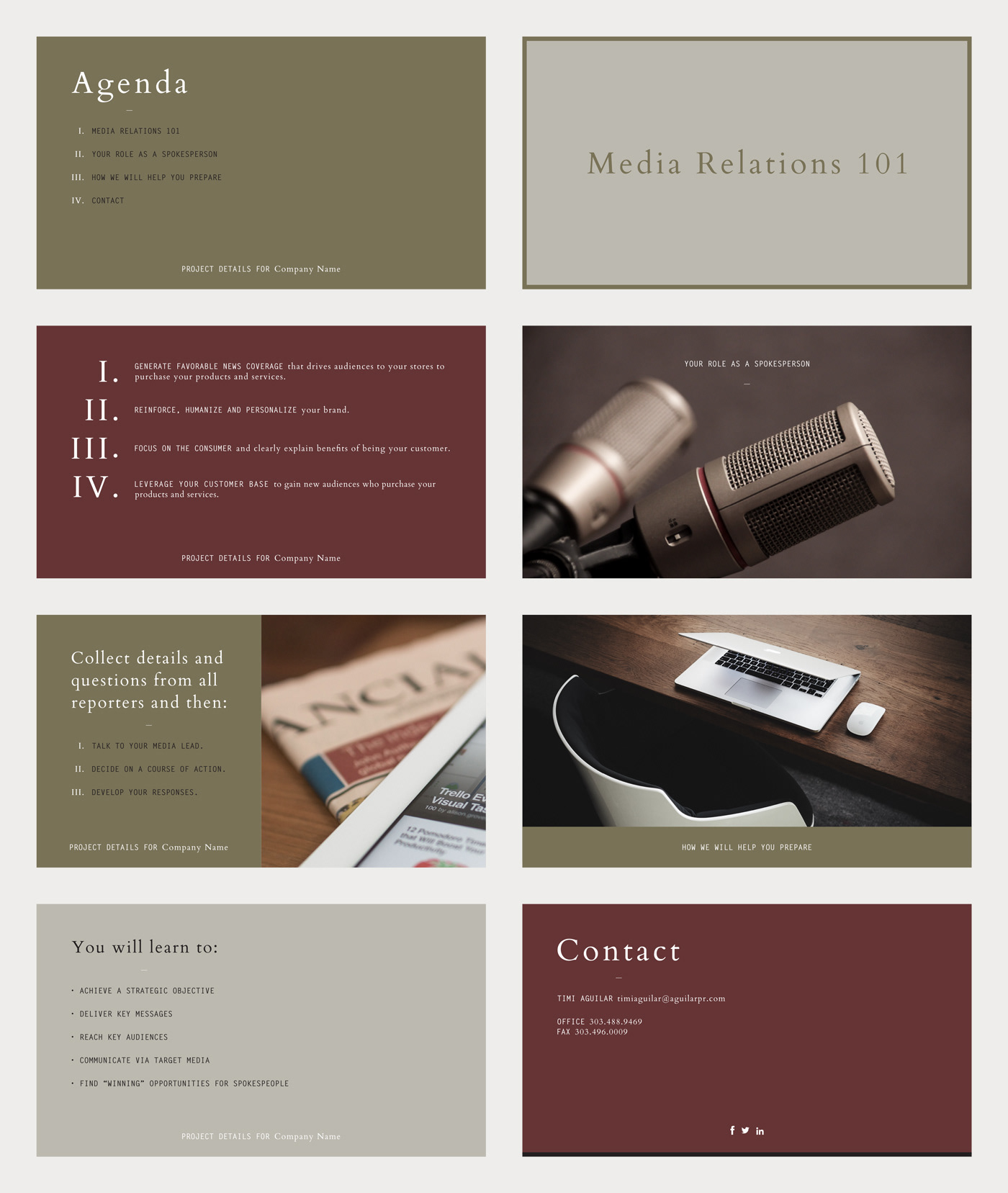 Example No. 01: PowerPoint template design for Aguilar Public Relations. I designed this to compliment their branding and printed collateral, both of which I worked on. The client needed a template they could easily work with so I created the final design using PowerPoint.